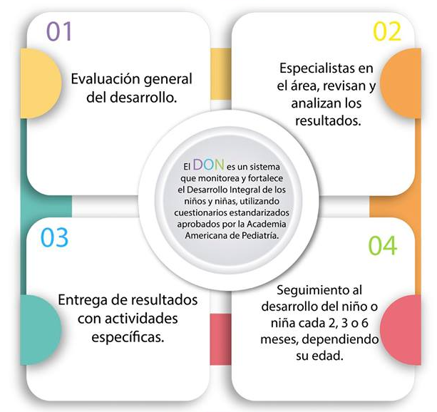 El DON es un sistema que monitorea y fortalece el Desarrollo Integral de los niños y niñas, utilizando cuestionarios estandarizados aprobados por la Academia Americana de Pediatría.